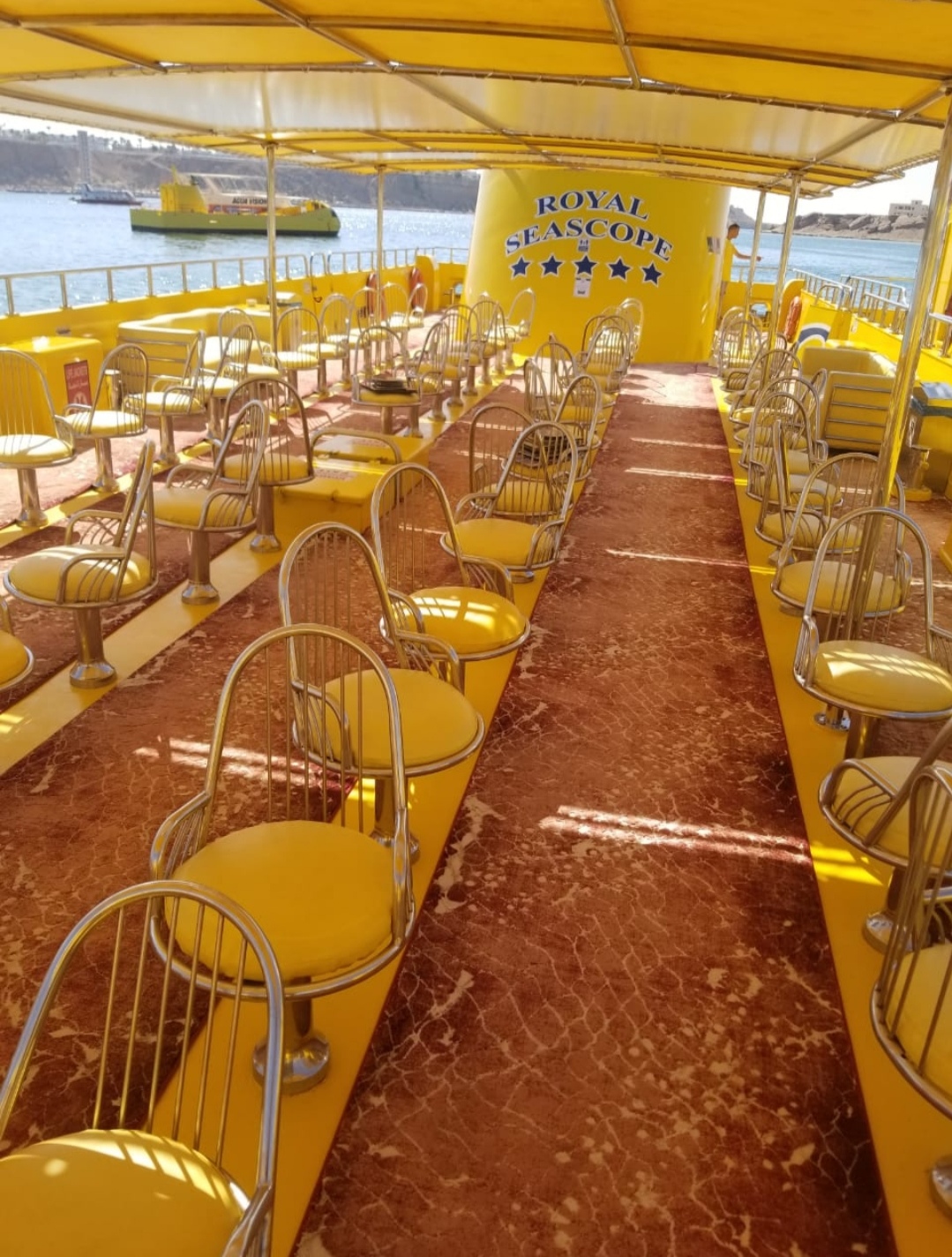 The bathyscaphe is not a boat with a transparent bottom, this large ship is two-story, the second floor is for seating in the air, but the first floor is this aquarium under water at a depth of 5 m where we will sit and watch the beauty of the Red Sea through the windows.